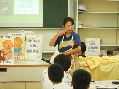 役場の保健師さんと、「みさ助産院」より助産師の前田さんをお招きし、人が誕生するまでの過程や赤ちゃんの抱っこのしかた、妊婦さんへの配慮等について、貴重なお話をしていただきました。様々な体験活動もあり、生命の尊さについてしっかりと学ぶことができました。