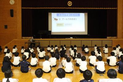 全校児童が体育館に集まり、プールの約束事を確認しました。