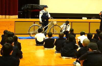 低学年は横断訓練、高学年は自転車点検の合言葉「ブタはしゃべる(ブレーキ・タイヤ・ハンドル・車体・ベル)」などを教わりました。